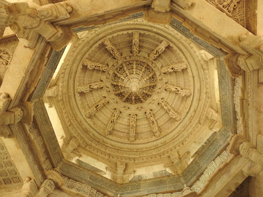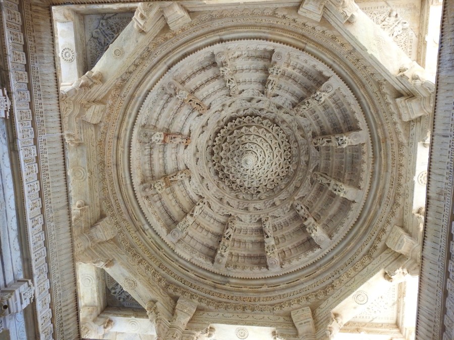 The Adinatha Temple is huge. ~1450 marble pillars are needed to support its structure. At the entrance, an akichaka is carved into the ceiling. It is a man with five bodies representing fire, water, heaven, earth, and air. The akichaka guards the temple.