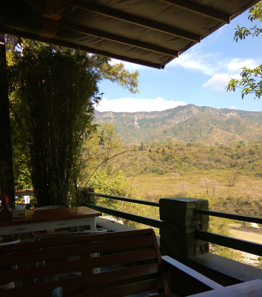 The view was of the mountains in the background & a riverbed in the foreground. We believe the riverbed would fill up during the monsoon season; that would make for an even better ambiance.