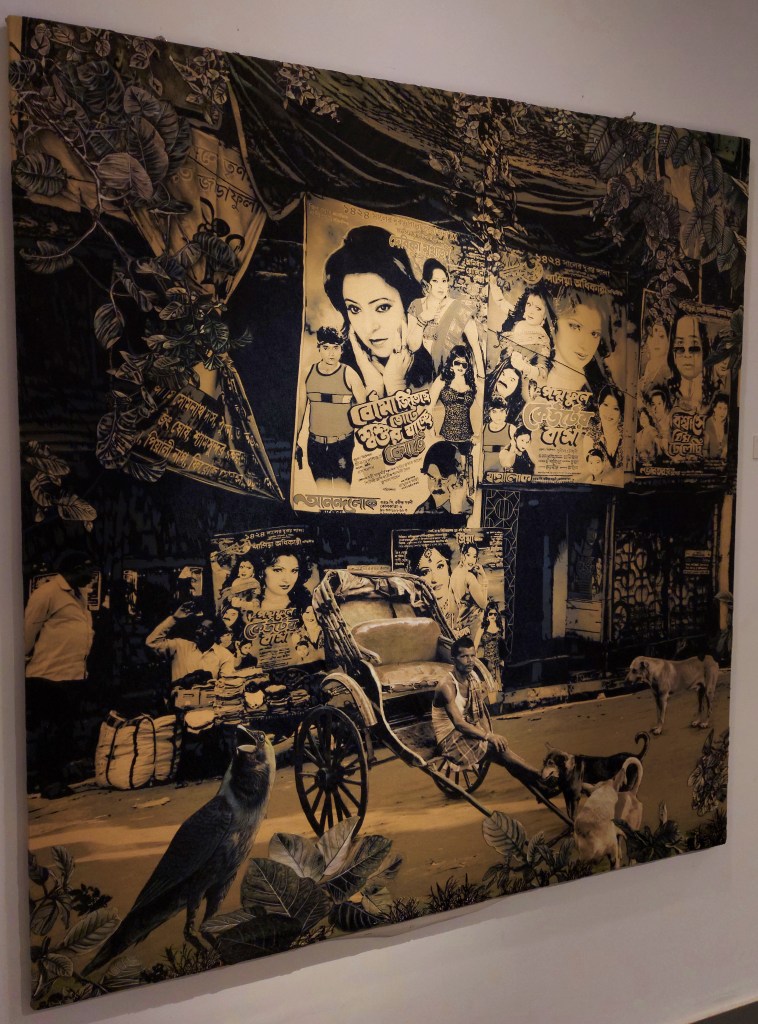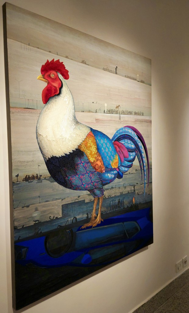 The very first set of art by Mr. Jagannath Panda caught my eye with its big & bright brocade birds (alliteration unintended!). The work The Custodian of Untold Truth (I) held my gaze for long. The multicolored rooster standing on an upturned Lamborghini with migrants on the move in the background (amongst other things) spoke ominously of a time when wealth will come crashing down when those whose labor helps in wealth creation will turn their backs on it.