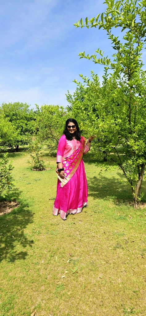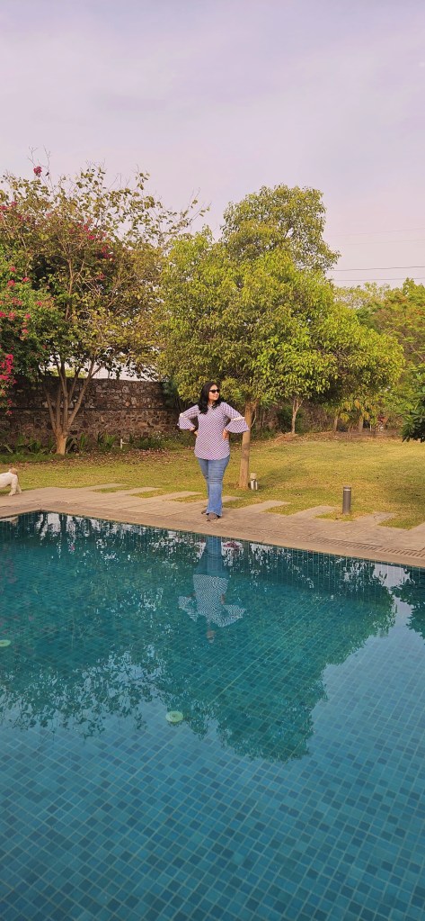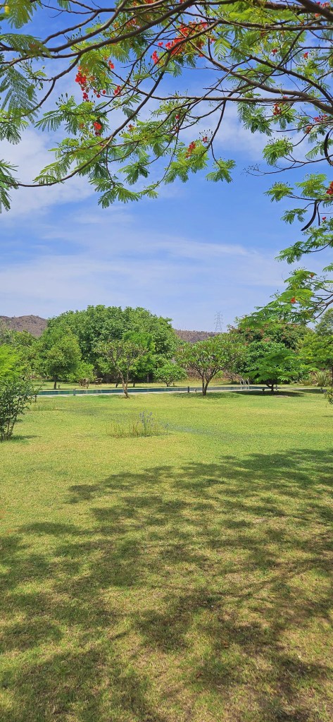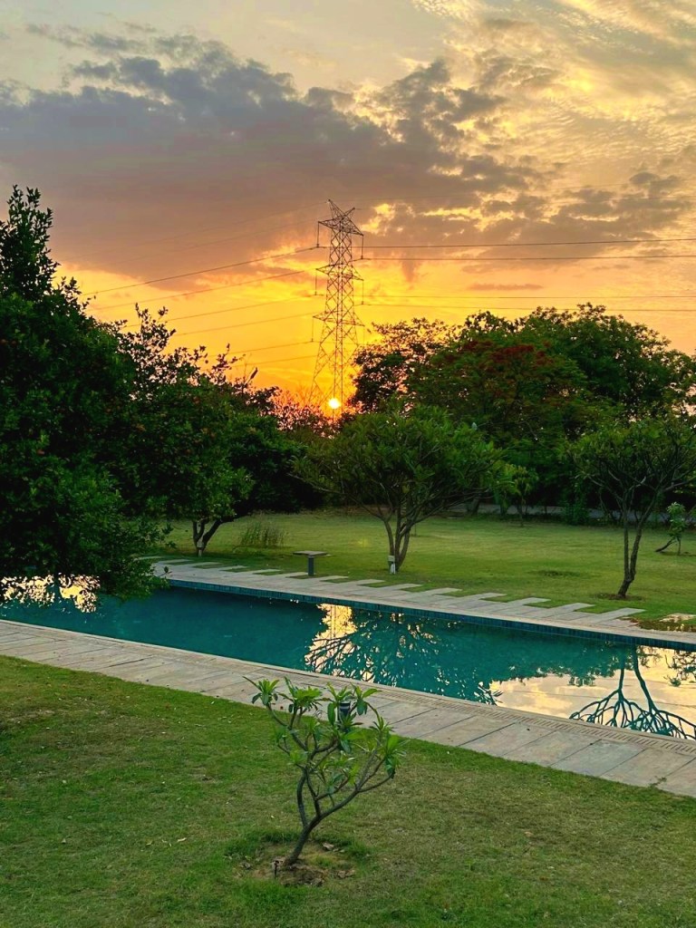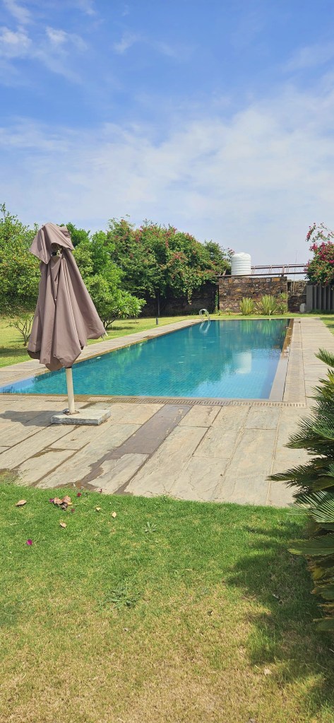 We parked our vehicle in the shade of a gulmohar & a jacaranda tree. As we walked down the pathway, the garden foreground was followed by the farm & orchard background. Closer to the farmhouse was also the swimming pool.
