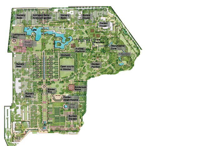 Water Features – Water features like lakes and ponds are a part of the Sunder Nursery. There are latticework pavilions on the lake edges.