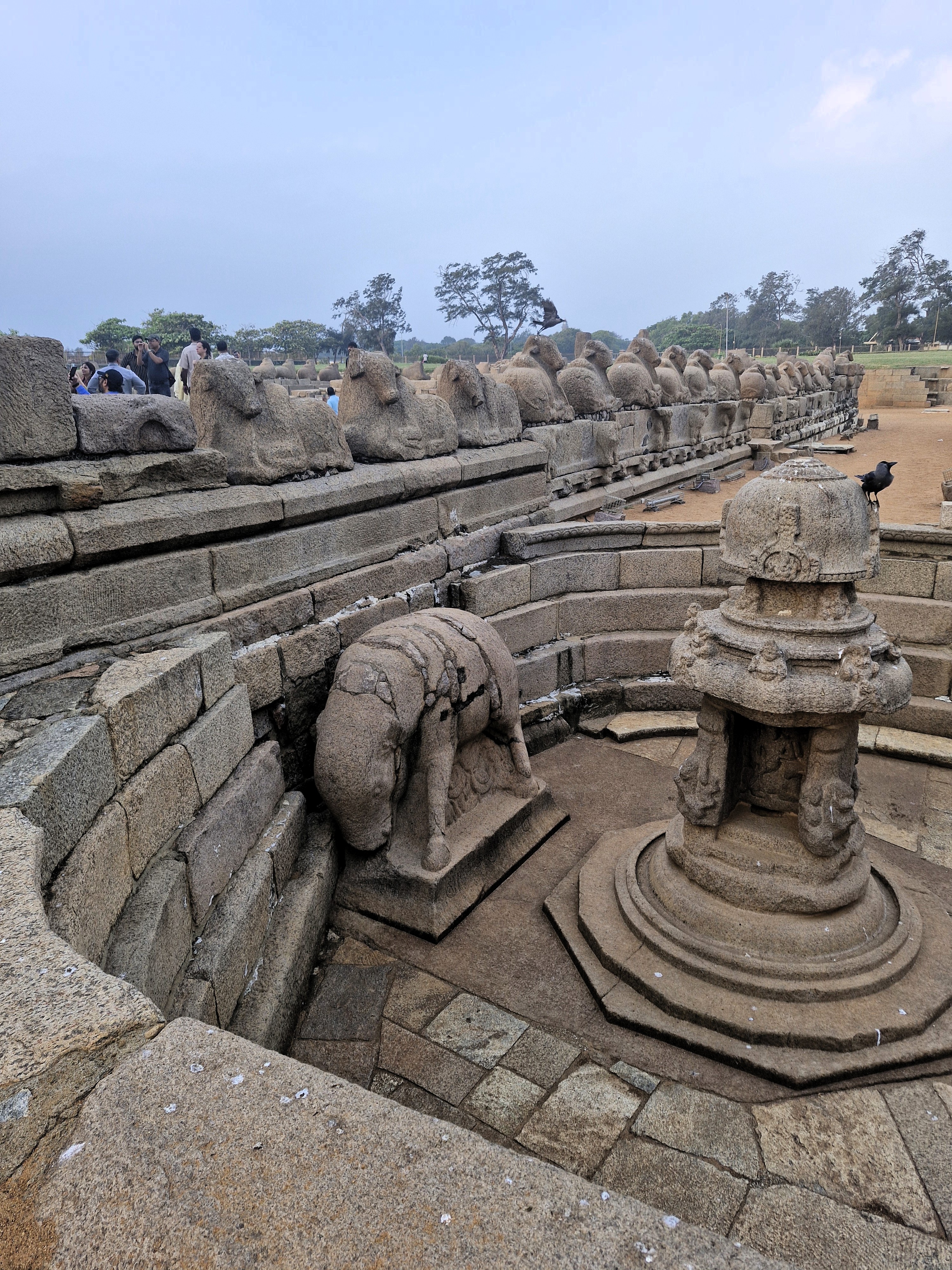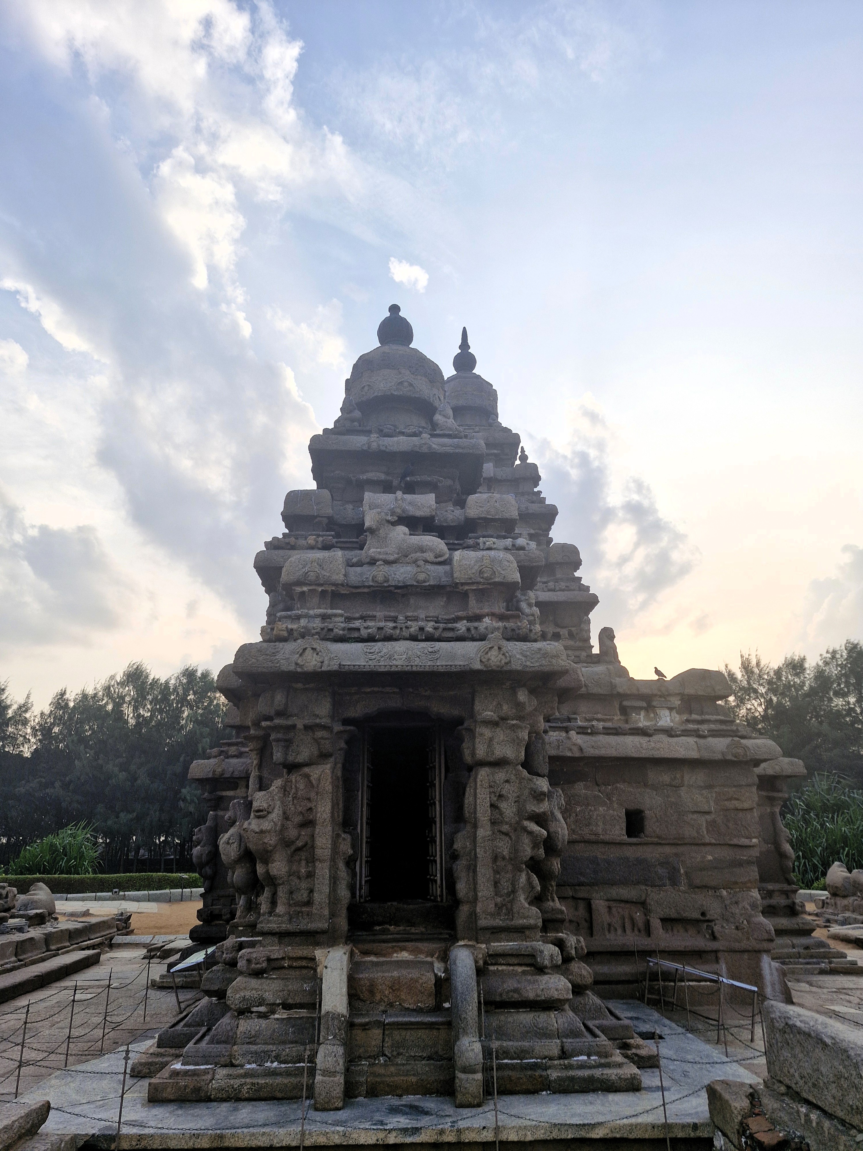 The Shore Temple has two carved towers which dazzle against the blue sky. One shrine is dedicated to Shiva. The other is dedicated to Vishnu. Inside one of the temples is a sculpture depicting various deities. A boundary wall topped by rock-cut Nandi statues surrounds the main temple. There is also a lion sculpture near one of the temples.