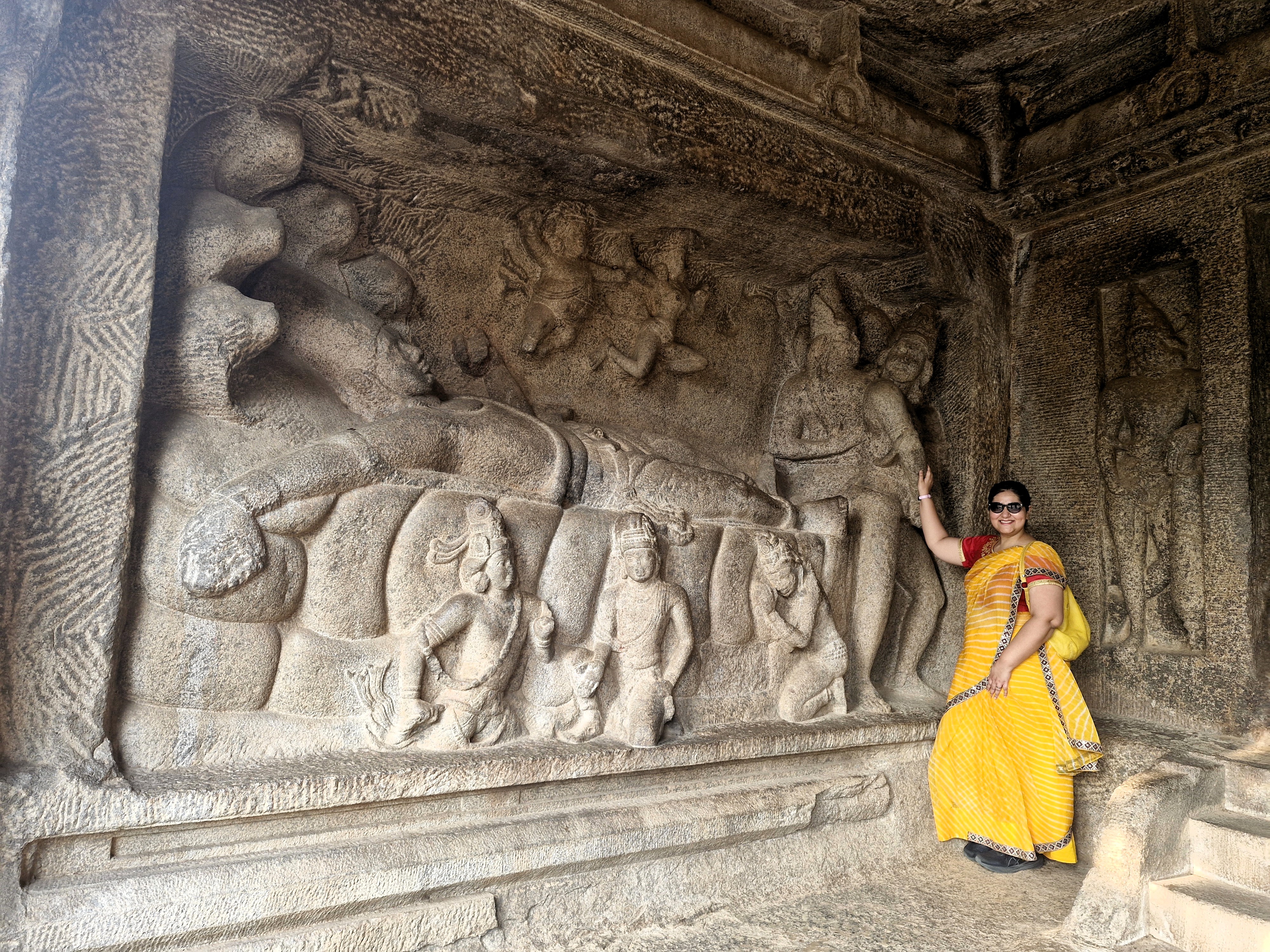 It is believed to be the world’s largest bas-relief. It is more popularly known as Arjuna’s Penance. It is also called the ‘Descent of the Ganges.’ Bas reliefs are structures protruding from the rock base. It is visible on the road itself and is a photo-op. Balu G informed that the main figure, in a ‘Tapasya’ (penance) mode, is Bhagirath (an ancient Indian king).